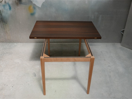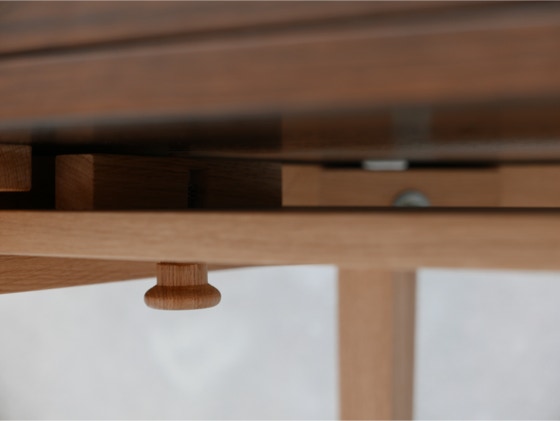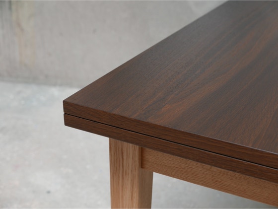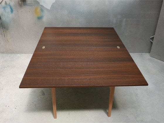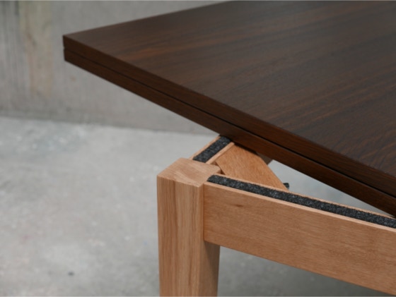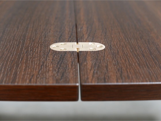 Das massive Untergestell verleiht dem Tisch seine Standfestigkeit während die leichte, furnierte Tischplatte dafür sorgt, dass das Drehen und Klappen ein Kinderspiel ist.