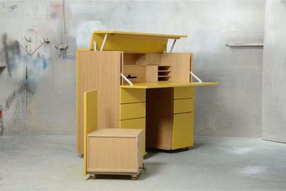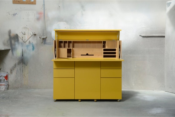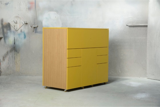 Ein mobiles Arbeitsmöbel mit Platz für Ordner, Drucker und alles, was man zum Arbeiten braucht.