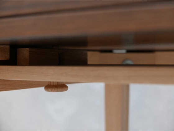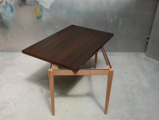 Das massive Untergestell verleiht dem Tisch seine Standfestigkeit während die leichte, furnierte Tischplatte dafür sorgt, dass das Drehen und Klappen ein Kinderspiel ist.
