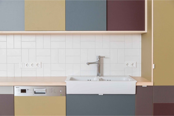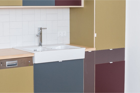 Eine einfache Küchenzeile in einer offenen Wohnküche. Selbstbewusst–aber nicht laut–bildet sie den Mittelpunkt der Wohnung und überzeugt dabei durch ihre Schlichtheit und die wertigen langlebigen Materialien.