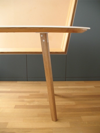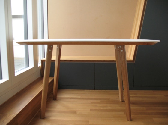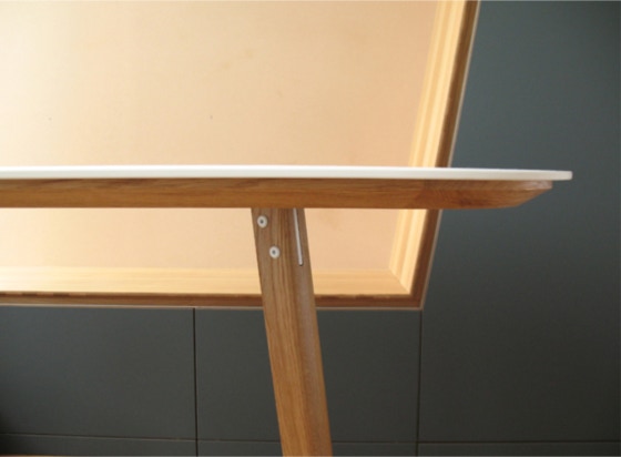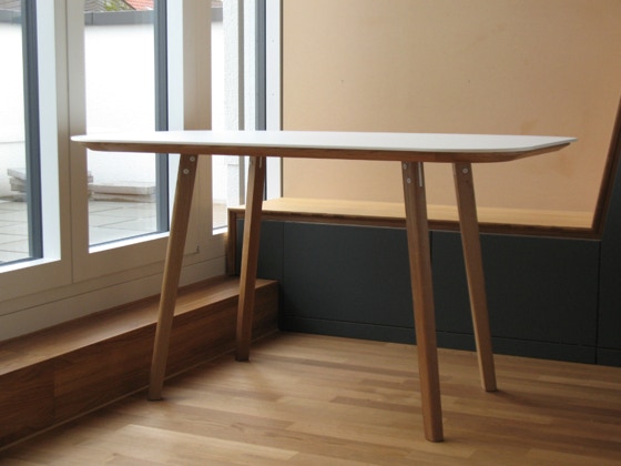 Holzwerkstoff, massive Eiche-Anleimer, dunkelblaues Linoleum, weißer Schichtstoff