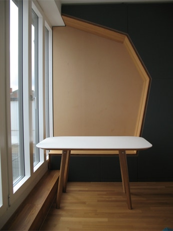 Die Sitznische an der großen Fensterfront bietet einen wunderschönen Platz und bildet zusammen mit dem filigranen Tisch ein einladendes Ensemble.